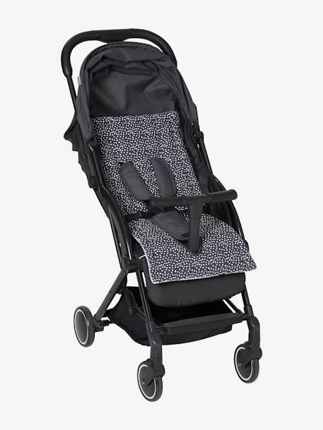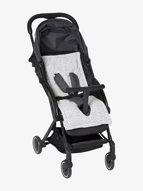 Protection réversible pour assise de poussette avec une face en toile pur coton et une face en éponge 80% coton, 20% polyester.